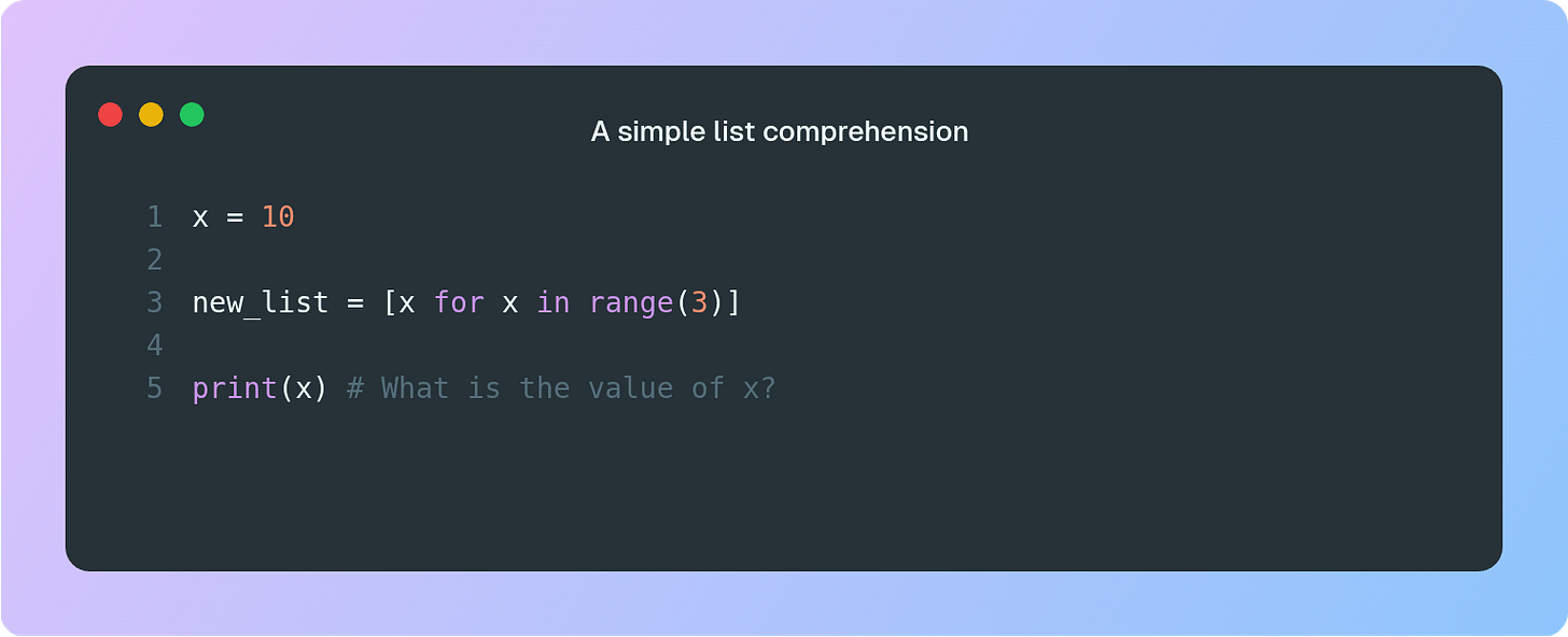 This code prints 10. The x in the comprehension is a new x. It does not touch the outer x. The list comprehension creates its own hidden scope.
