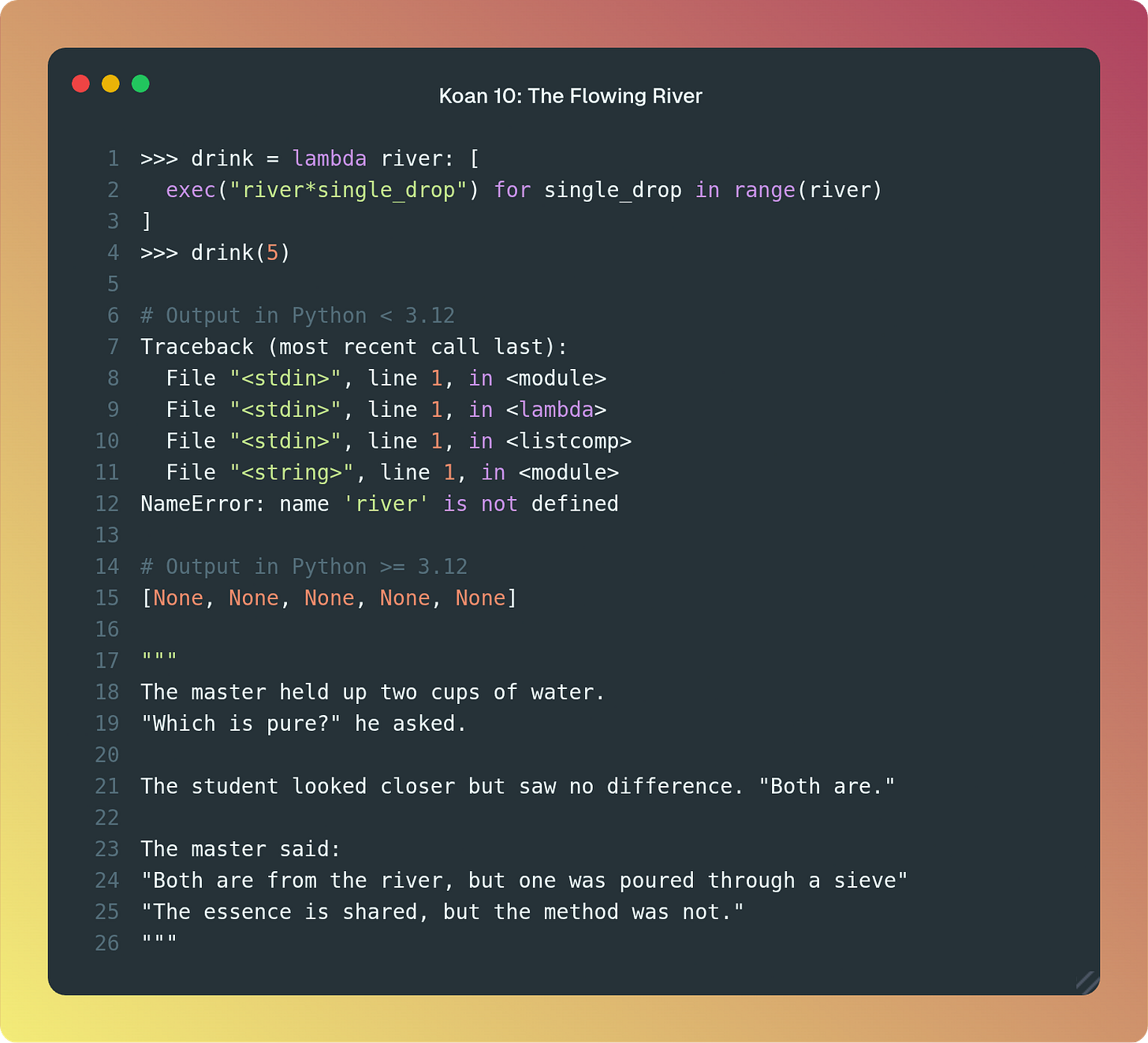 In Koan 4 we learnt that Python has 4 scopes (Local, Enclosing, Global and Builtin). However, there is also another “hidden” scope. Consider this loop: