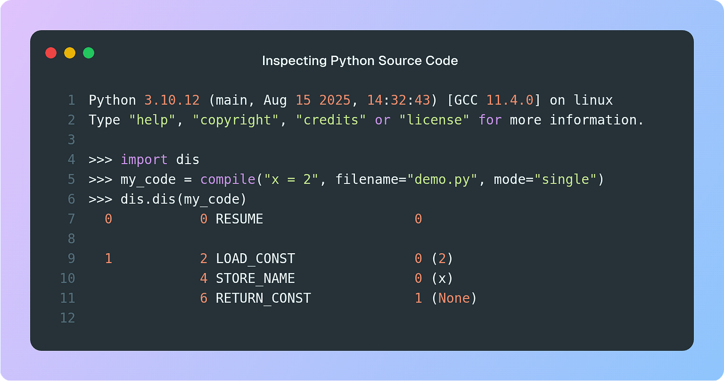 Inspecting the bytecode can inform us about how the program is run by the interpreter. However, the bytecode is stored in an efficient binary format that is not human readable.