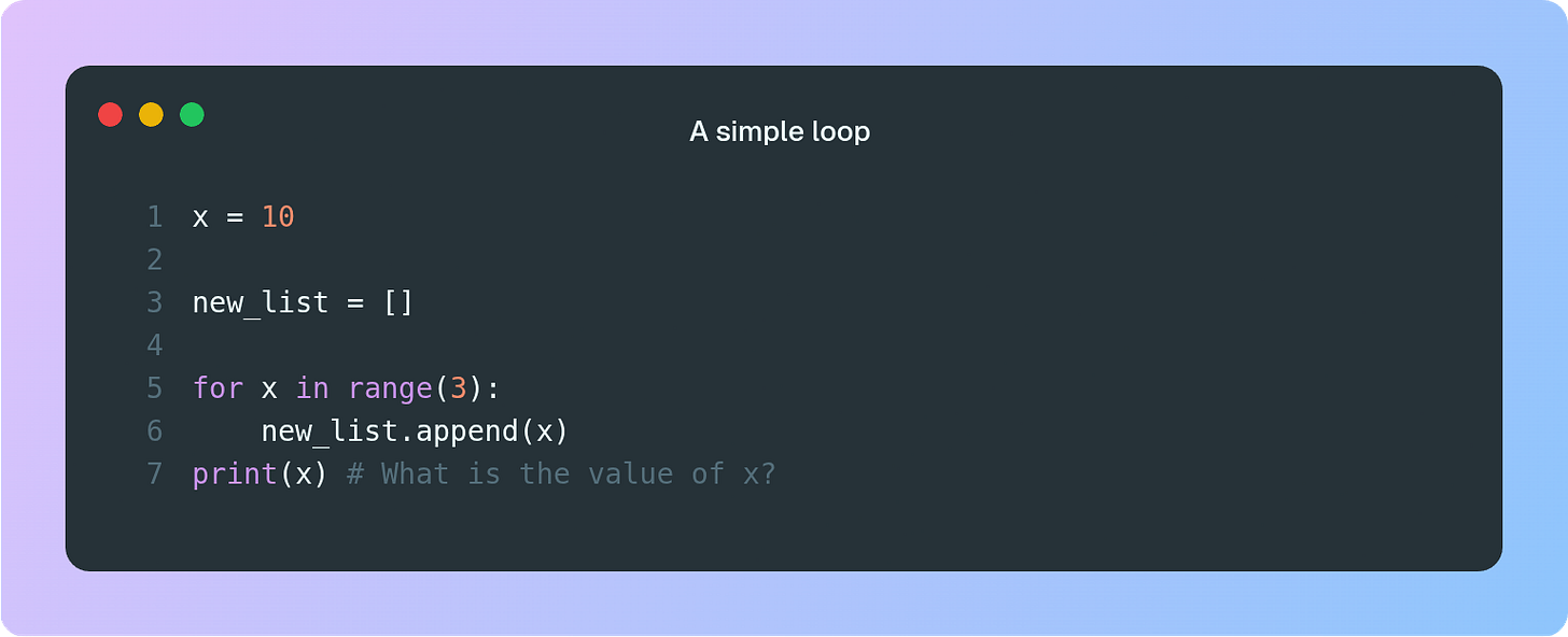 The loop above reassigns the value of x in the enclosing scope. After the loop runs, x is no longer 10. Its value is now 2. The loop's variable x "leaked" into the surrounding code.
