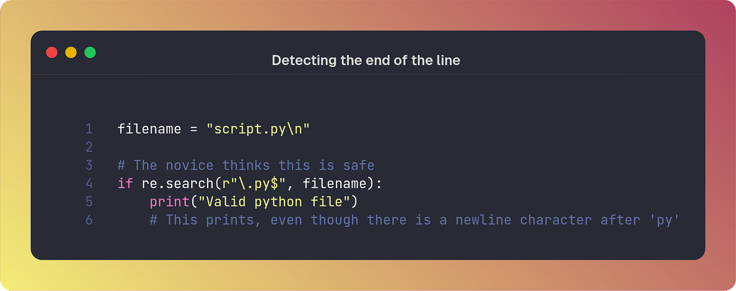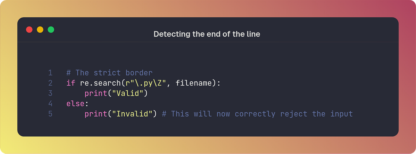 By default, the $ anchor matches the end of the string or the position immediately preceding a newline at the very end. This is fine most of the time, but sometimes you may want to verify that a string contains no trailing whitespace or newlines: