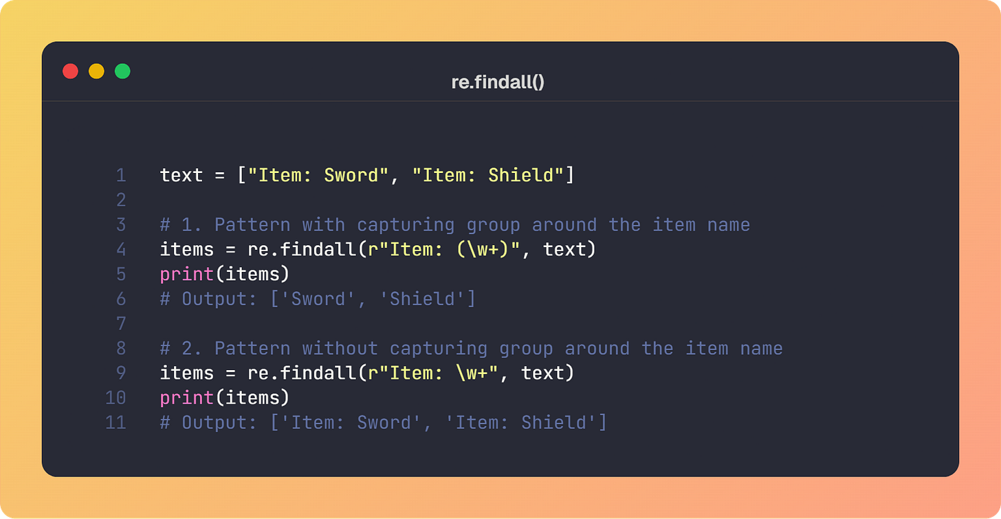 The re.findall() method is a powerful tool for gathering all occurrences. However, its changes it’s return type based on the pesence of “capturing groups” (parentheses) in the regex.