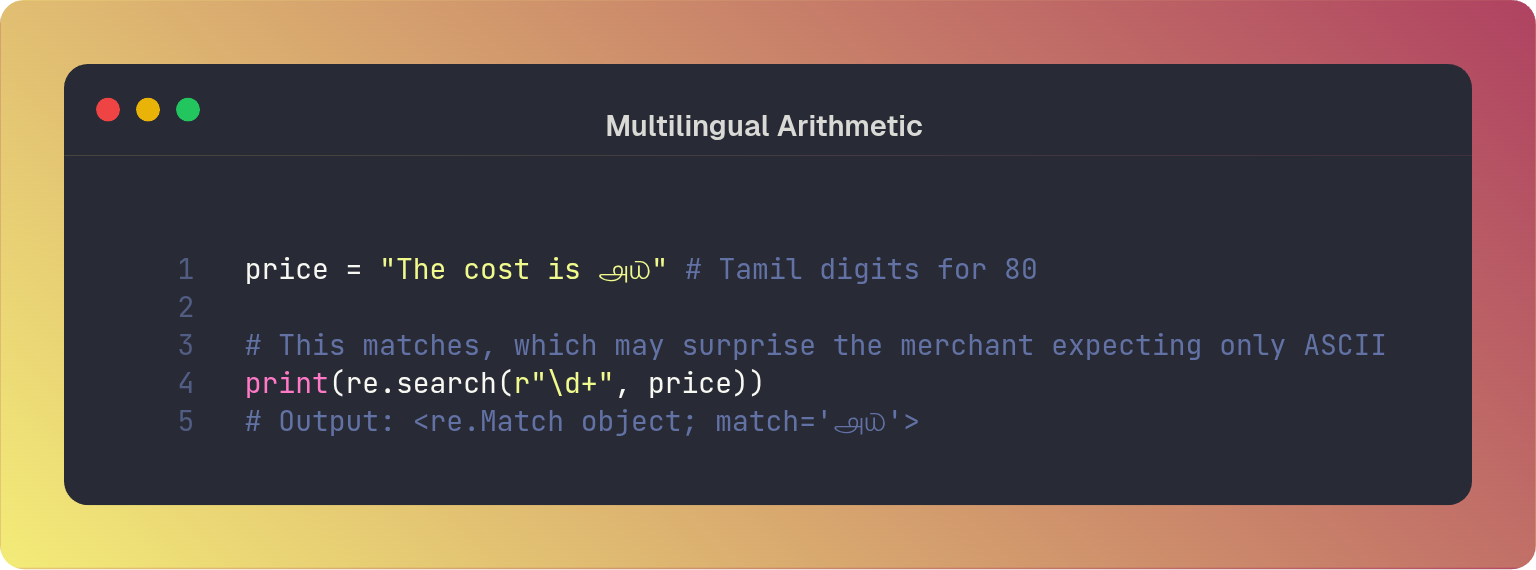 When a developer writes a regex to extract a price, they might assume \d+ will only return characters that can be easily cast to an integer using standard libraries, or characters they can safely display in an ASCII-only receipt.