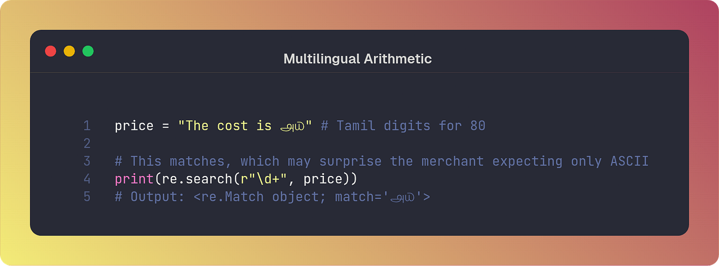 You can imagine the chaos that would be caused if a payment system accepts ௮௰ as a valid “number” but the downstream payment processor only understands 80. It might crash or, worse, treat the value as 0 or null, leading to logic errors.
