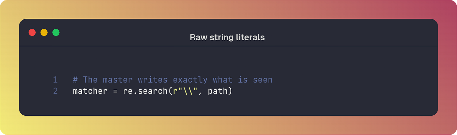 match) or a scout (search)Use raw strings over escaped backslashes.