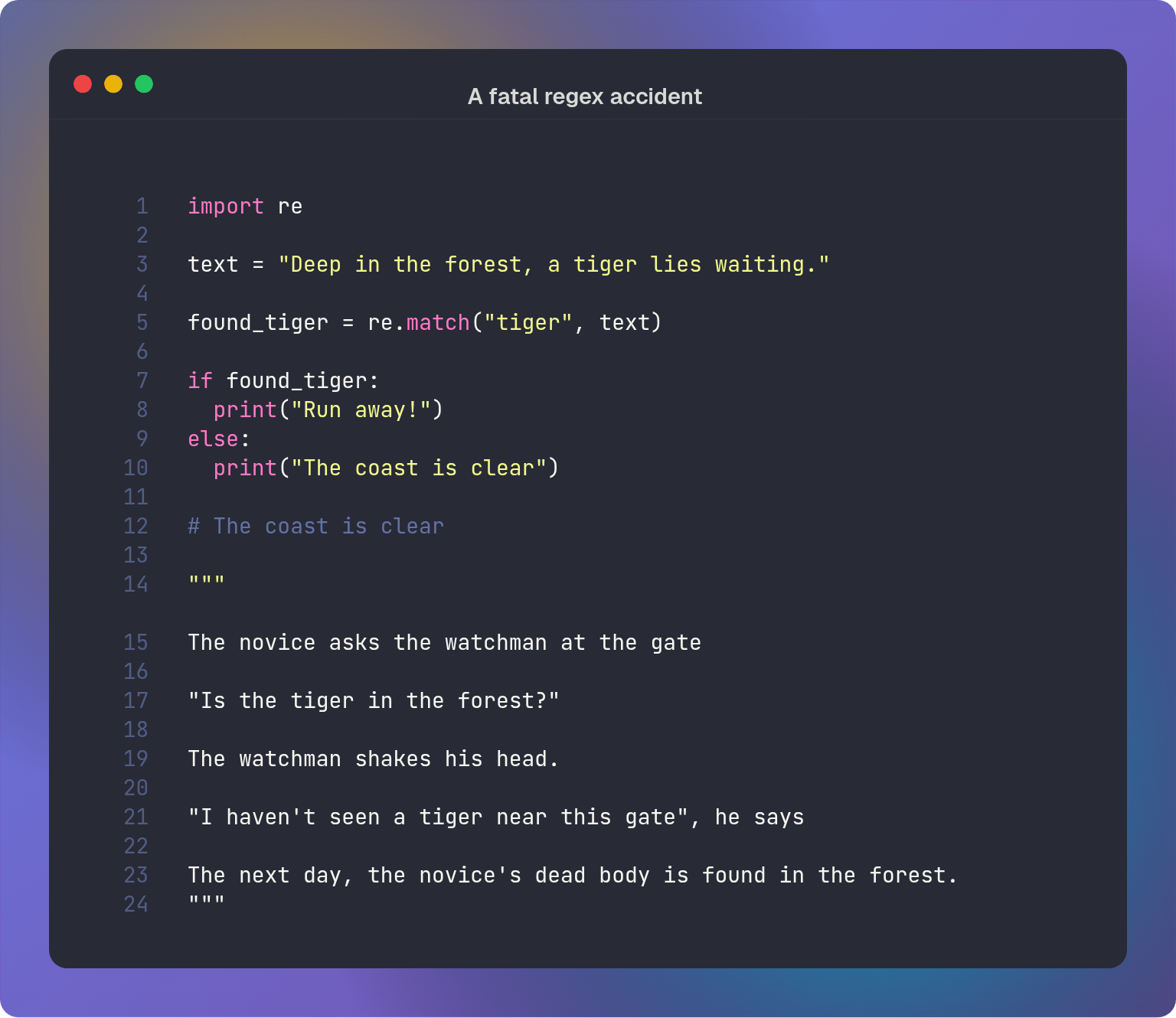 As you can see this is prone to error as you can easily use the wrong number of backslashes. A master uses raw string literals instead2 (r""). This tells Python to ignore the escape sequences and pass the string exactly as written to the regex engine.