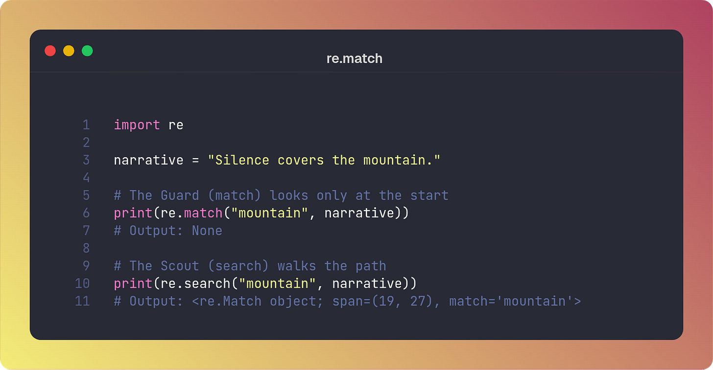 A common misconception is that re.match() scans the entire string. In reality, it is implicitly anchored to the start of the string (effectively adding a \A or ^ anchor). If you want to find a pattern anywhere in the input, use re.search() instead.