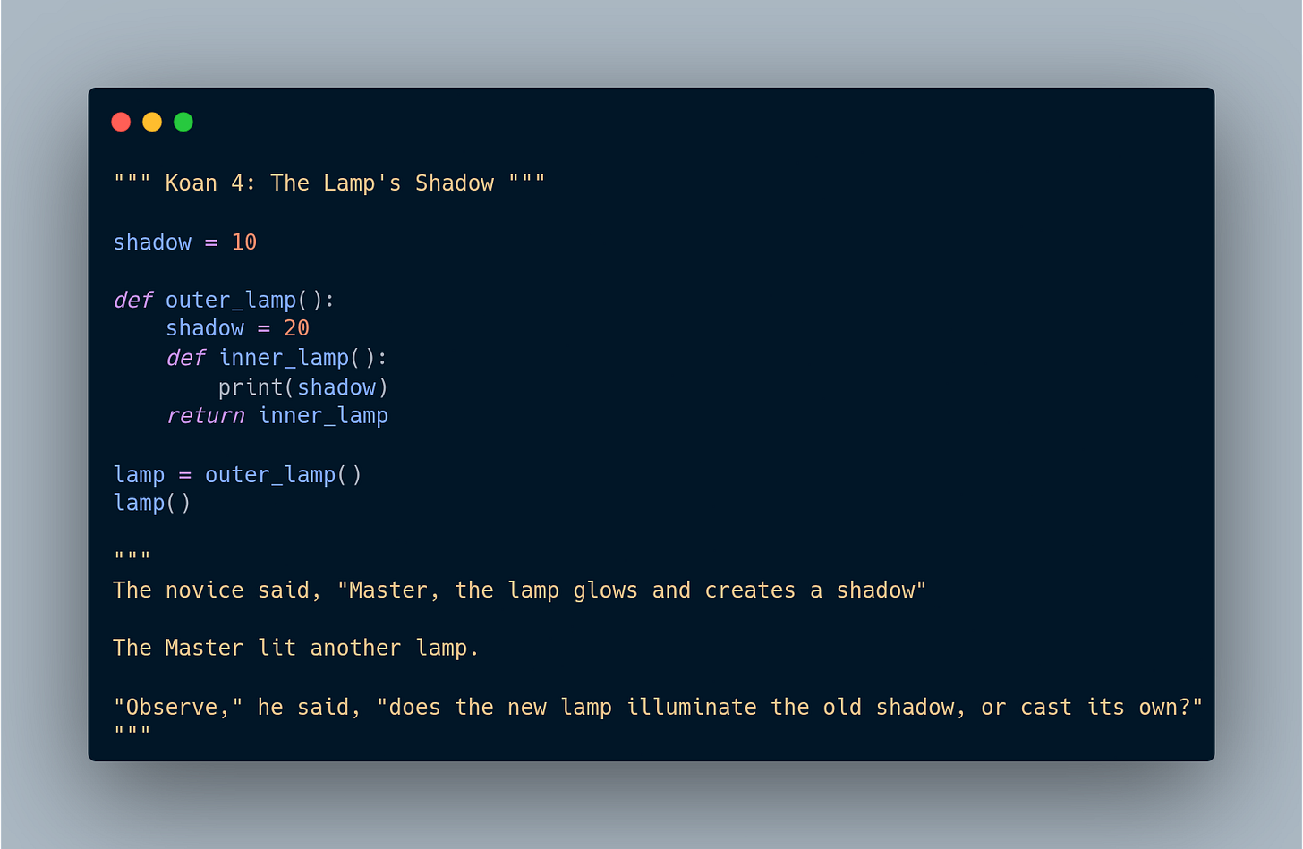 The Master's second lamp illuminated the truth: each lamp casts its own shadow. Similarly, in Python, each scope can define its own variables, creating distinct 'lamps' of variables. Without explicit instruction (like nonlocal
