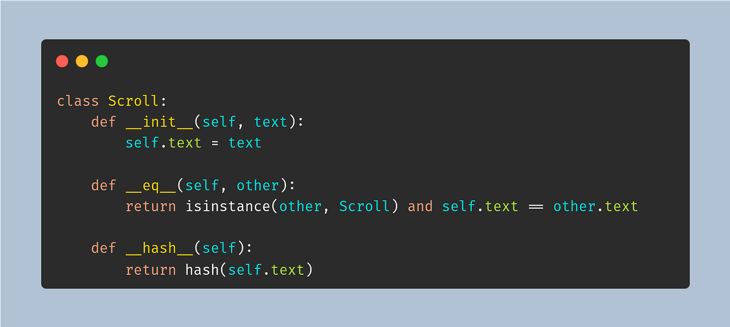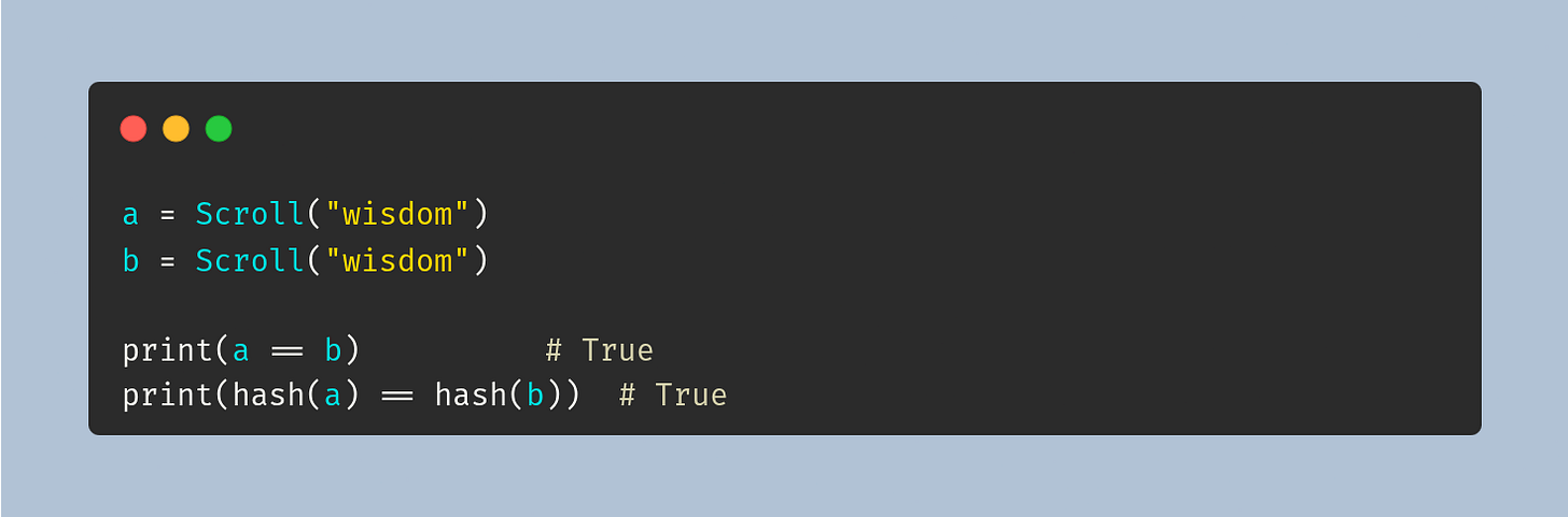 Now two scrolls with the same text are considered equal, and they share the same hash: