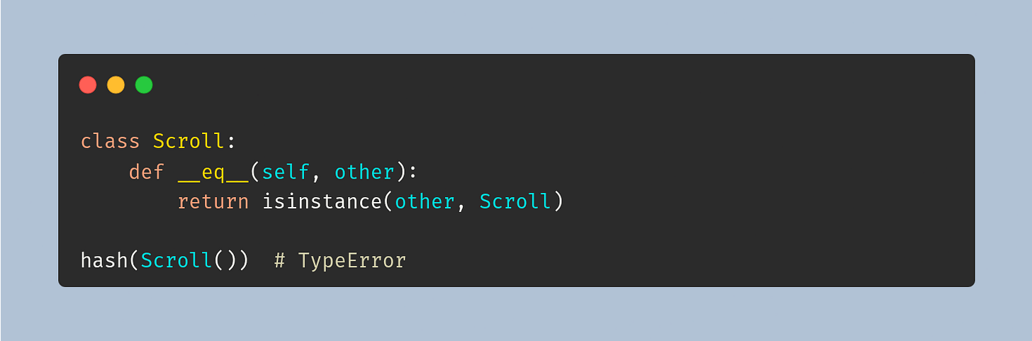 Why? Because hash-based collections require a consistent contract: objects that are equal must share the same hash, but Python does not forbid unequal objects from sharing a hash.