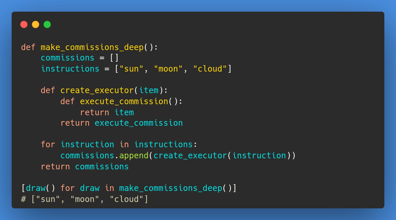 , its value is isolated from the outer loop's changes (as we learnt in Koan 4 about Python’s LEGB rule). Each call to create_executor