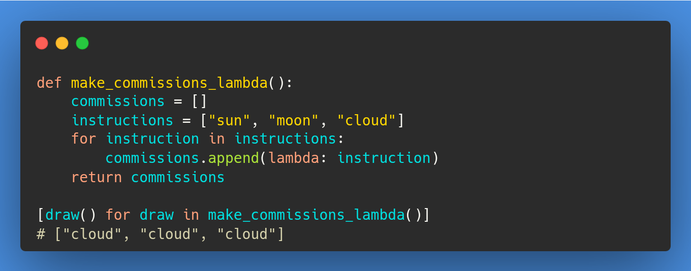This principle of late binding also applies to lambda functions. As we learnt in Koan 5, lambdas are simply anonymous functions. The "lazy calligrapher" effect is very common when lambdas are created in a loop.