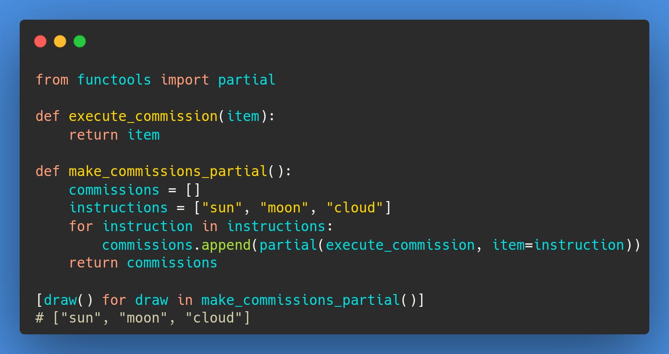 There are other, more concise or functional ways to achieve the same result. The choice of method often comes down to the clarity and style you prefer. We can use functools.partial