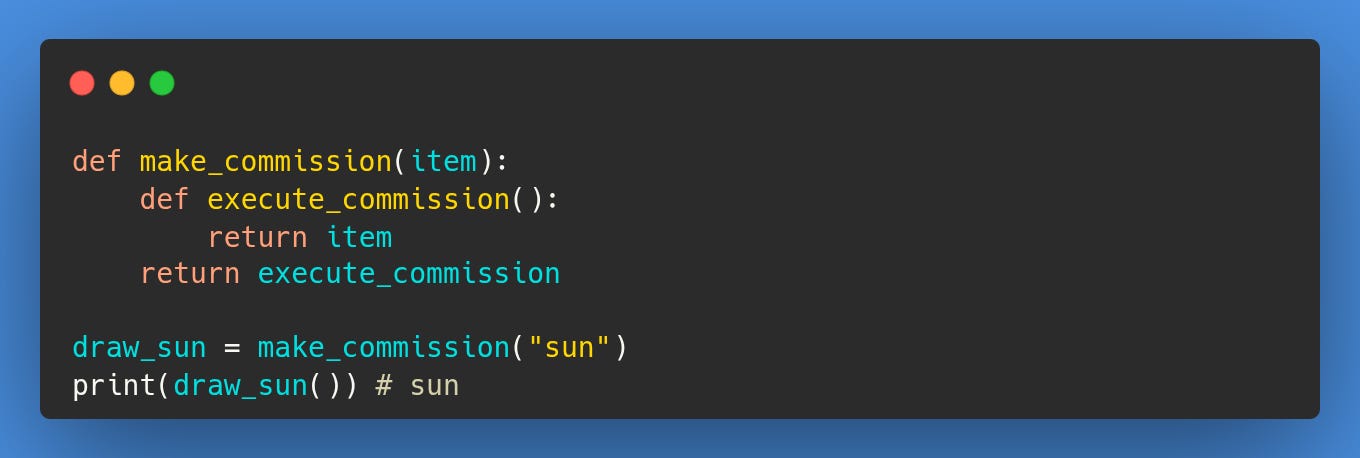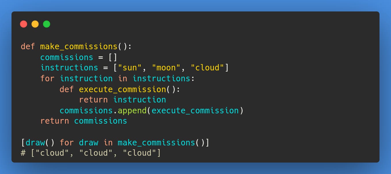 In Python, a function is more than a list of commands, as we learnt in Koan 5. When a function is defined inside another, it becomes a closure, a small piece of code that remembers its parent's environment. This memory is powerful, but it's not a picture of the past. It's more like a window. It shows you the world as it is right now, not as it was when the window was first opened. This phenomenon is known as late binding.